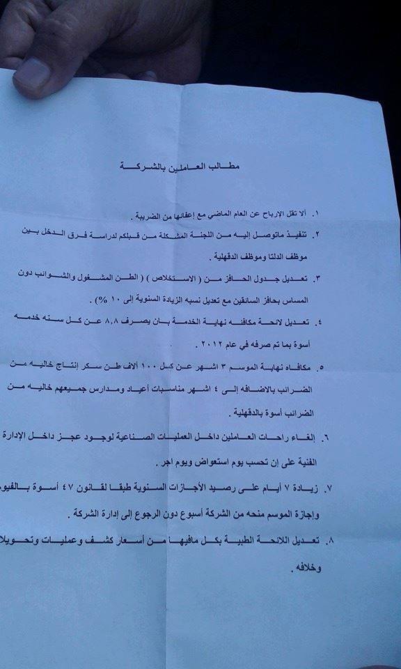 وتمثلت مطالب العمال في 8 مطالب؛ هي كالآتي، بحسب نص بيان العمال: