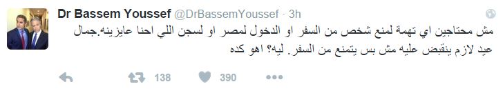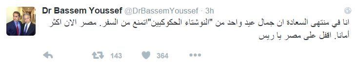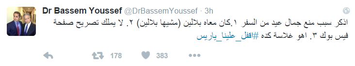 وسخر الإعلامي باسم يوسف، من قرار منع الناشط الحقوقي جمال عيد، مدير الشبكة العربية لحقوق الإنسان من السفر، وذلك عبر عدة تغريدات على حسابه في موقع “تويتر”.