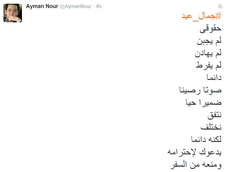 وأعرب العديد من السياسيين والإعلاميين، عن تضامنهم مع عيد؛ حيث قال زعيم حزب “غد الثورة” أيمن نور -في تغريدة له-: “جمال عيد حقوقي لم يجبن، لم يهادن، لم يفرط، وهو دائمًا صوت رصين، وضمير حي، نتفق أو نختلف، لكنه دائمًا يدعوك لاحترامه، ومنعه من السفر شهادة جديدة بحقه”.