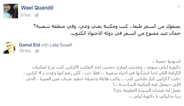وانتقد الكاتب الصحفي، وائل قنديل، قرار منع الناشط الحقوقي جمال عيد، مدير الشبكة العربية لحقوق الإنسان من السفر؛ حيث كتب منشورًا -عبر صفحته الشخصية بموقع التواصل الاجتماعي “فيس بوك”- قال فيه: “يمنعوك من السفر طبعًا.. كتب ومكتبة يعني وعي، وفي منطقة شعبية؟ جمال عيد ممنوع من السفر في دولة الاحتواء الكذوب”.