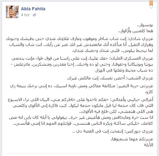 اعتذرت الدمية الشهيرة “أبلة فاهيتا” مقدمة برنامج “لايف من الدوبلكس” عن البيان الذي صدر باسمها يتبرأ من شادي أبوزيد، بعد فيديو البالونات المسيئة، وذلك عبر صفحتها الرسمية بموقع التواصل الاجتماعي “فيس بوك”.