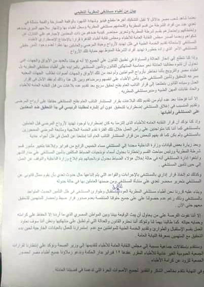 أصدر أطباء مستشفى المطرية التعليمي بيانا موجها إلى النقابة العامة لأطباء مصر، أعلنوا فيه استقالتهم الجماعية المسببة لتقديمها إلى وزير الصحة، في حالة عدم محاكمة أمناء الشرطة المعتدين على طبيبين بالمستشفى.