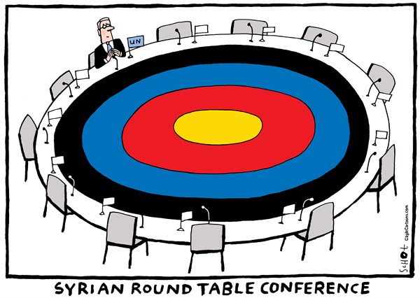 وعن مفاوضات السلام في جينيف من أجل سوريا قدم موقع “بولتيكال كارتونز” هذا الرسم: