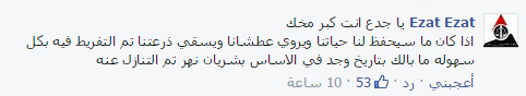 – Ezat : يا جدع انت كبر مخك ، اذا كان ما سيحفظ لنا حياتنا ويروي عطشانا ويسقي زرعتنا تم التفريط فيه بكل سهولة ما بالك بتاريخ وجد في الأساس بشريان نهر تم التنازل عنه