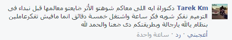 – tarek : دكتوراة ايه اللى معاكم شوهتو الآثار، ضيعتوا معالمها، قبل ما نبدأ فى الترميم نفكر شويه فكر ساعة واشتغل خمسة دقائق انما مافيش تفكير، عاملين بنظام يالله يارجالة وبطريقتكم دى ضعنا والحمد لله