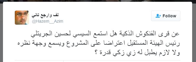 انتقد الناشط السياسي الدكتور حازم عبدالعظيم، قيام عبدالفتاح السيسي بإنشاء قرية ذكية جديدة، في حين أنه لا يهتم بكفاءة القرى القديمة، وذلك خلال تغريدتين نشرهما عبر حسابه الشخصي بموقع التغريدات القصيرة “تويتر”.