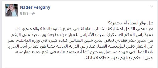 هاجم أستاذ العلوم السياسية الدكتور نادر فرجاني، دعوة السيسي لأولتراس النادي الأهلي للحوار ومباشرة التحقيقات في أحداث مجزرة بورسعيد، وذلك خلال تعليق نشره عبر حسابه الشخصي بموقع التواصل الاجتماعي “فيس بوك”.