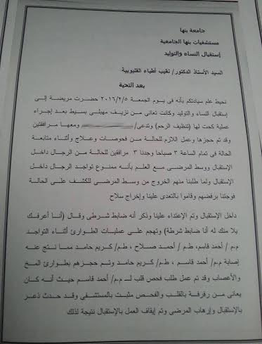 وأكد البيان اقتحام 3 مرافقين من الرجال لاستقبال النساء بمستشفى بنها الجامعي مع العلم بأنه يمنع منعا باتا تواجد الرجال داخل الاستقبال وعندما طلب الأطباء منهم الخروج للكشف على الحالة رفضوا وقام أحدهم بالتعدي وإخراج سلاح داخل الاستقبال مشيرا إلى أنه ضابط شرطة وقام بالتهجم عليهم.