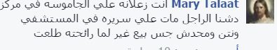 :Mary Talaat “انت زعلان على جاموسة؟ في مركز دشنا الراجل مات على سريره في المستشفى ونتن ومحدش حس بيه غير لما رائحته طلعت”.
