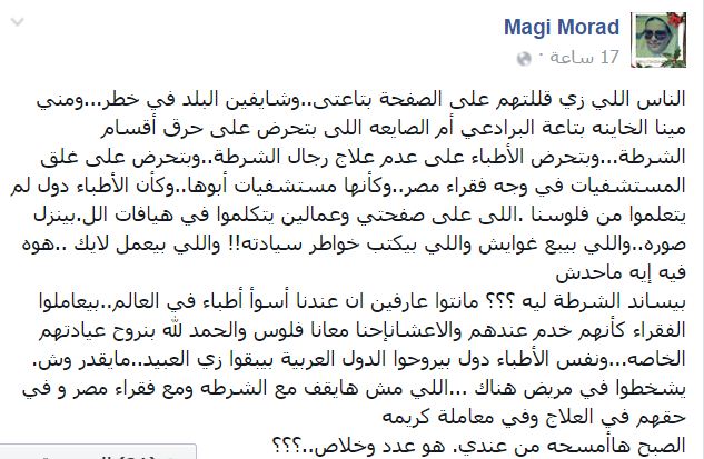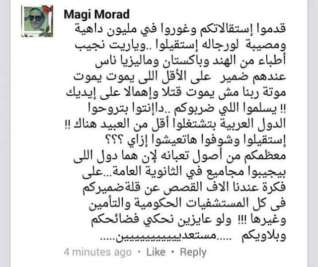 وقالت السيدة التي تدعى ماجي مراد -عبر صفحتها على موقع “فيس بوك”: “قدموا استقالاتكم وغوروا في مليون داهية ومصيبة لو رجالة استقيلوا،، وياريت نجيب أطباء من الهند وباكستان وماليزيا ناس عندهم ضمير على الأقل اللي يموت يموت موتة ربنا مش يموت قتلا وإهمالا على إيديك”.
