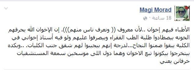وتكتب ماجي مراد على صفحتها عدد من المنشورات التي تهاجم فيها نقابة الأطباء وتؤكد انتماء الكثير منهم للإخوان المسلمين، وأنهم أسوأ أطباء في العالم، كما اتهمت الدكتورة منى مينا بأنها خائنة وتهاجم نجلتها لأنها أسهمت في إحراق أحد أقسام الشرطة في ثورة يناير.