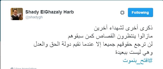 – شادي الغزالي حرب: “ذكرى أخرى لشهداء آخرين، ما زالوا ينتظرون القصاص كمن سبقوهم، لن ترجع حقوقهم جميعًا إلا عندما نقيم دولة الحق والعدل، وهي ليست ببعيدة”.