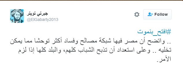 - ElGabarty: “واتضح إن مصر فيها شبكة مصالح وفساد أكثر توحشًا مما يمكن تخيله.. وعلى استعداد أن تذبح الشباب كلهم، والبلد كلها إذا لزم الأمر”.