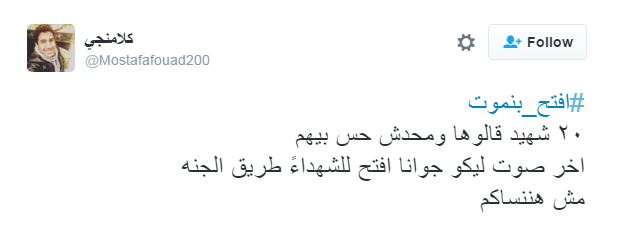تصدر هاشتاج #افتح_بنموت، قائمة الأكثر تداولًا عبر “تويتر”، تزامنًا مع مرور عام على مذبحة الدفاع الجوي؛ حيث تمر اليوم الذكرى الأولى لمذبحة الدفاع الجوي، والتي قتل فيها عشرون مشجعًا من جماهير رابطة الأولتراس، بعد أن حبستهم قوات الأمن داخل الممر المؤدي للملعب، وأطلقت عليهم قنابل الغاز، وطلقات الخرطوش.