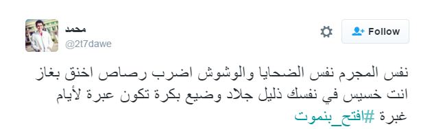 – محمد: “نفس المجرم.. نفس الضحايا والوشوش.. اضرب رصاص.. اخنق بغاز.. انت خسيس في نفسك.. ذليل جلاد.. وضيع، بكره تكون عبرة لأيام غبرة”.