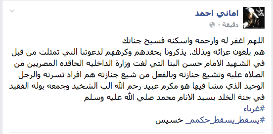 وقال أماني أحمد: “هم يلغون عزاءه وبذلك يذكرونا بحقدهم وكرههم لدعوتنا التي تمثلت من قبل في الشهيد الإمام حسن البنا التي ألغت وزارة الداخلية الحاقدة المصريين من الصلاة عليه وتشييع جنازته وبالفعل من شيع جنازته هم أفراد أسرته والرجل الوحيد الذي مشى فيها هو مكرم عبيد”.