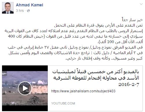 وقال كامل في منشور له عبر حسابه الرسمي على موقع التواصل الاجتماعي “فيس بوك”، استمرار الروس بطلب من النظام التقدم رغم عدم توفر عدد كاف من القوات البرية معه سيؤدي إلى خسارته ما تبقى لديه من عدد قليل من القوات (جيش النظام كان 400 ألف، الآن أقل من 100 ألف).