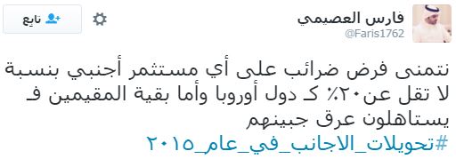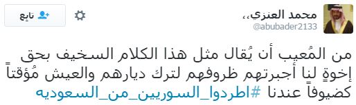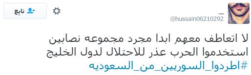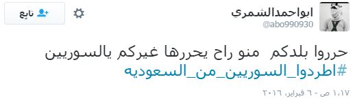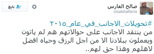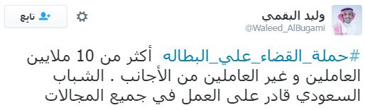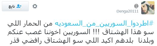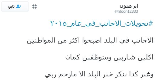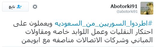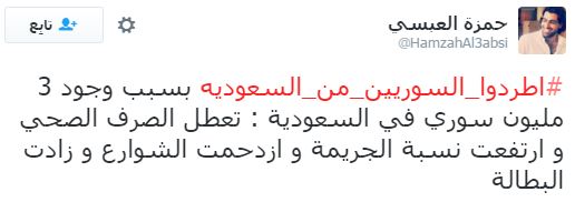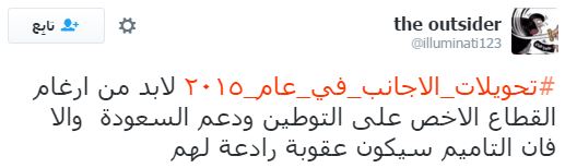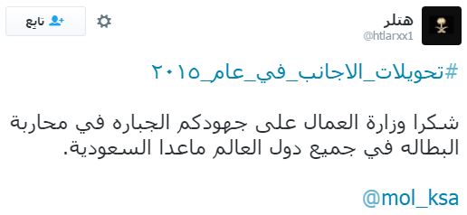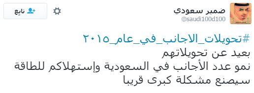 “#حملة_القضاء_علي_البطاله”، “#تحويلات_الأجانب_في_عام_٢٠١٥”، “#اطردوا_السوريين_من_السعودية”.