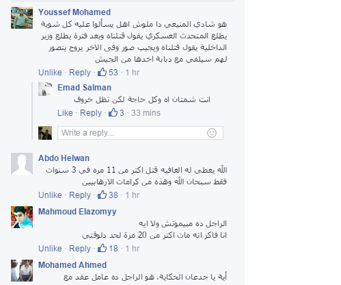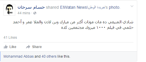 وأضاف الناشط حسام سرحان “شادي المنيعي ده مات موتات أكتر من مبارك وبن لادن والملا عمر وأحمد حلمي في فيلم ١٠٠٠ مبروك مجتمعين كده”.