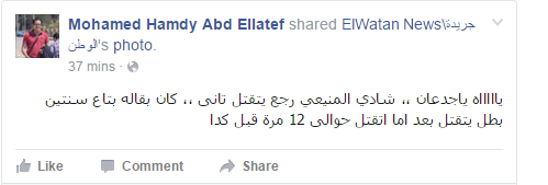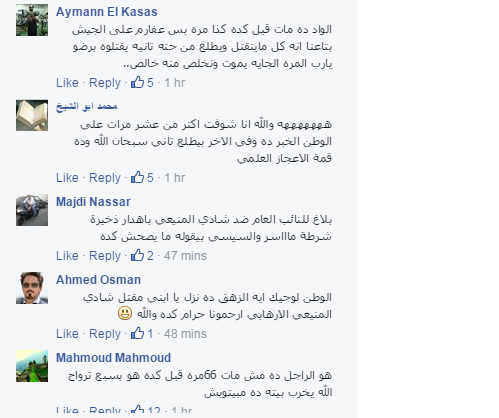 وكتب أيمن القصاص: “الواد ده مات قبل كده كذا مره بس عفارم على الجيش بتاعنا انه كل ما يتقتل ويطلع من حته تانيه يقتلوه برضوا يارب المره الجايه يموت ونخلص منه خالص”.