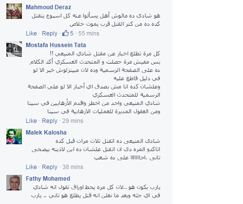 وسخر النشطاء من الخبر؛ حيث إنها ليست المرة الأولى التي يعلن فيها مقتل المنيعي؛ حيث أعلن المتحدث العسكري، في أكثر من مرة، مقتل المنيعي، وبعدها يخرج المنيعي في إحدى عمليات تنظيم الدولة في سيناء.