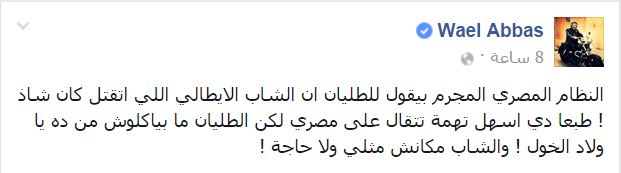 وقال “عباس” -في منشور له على موقع “فيس بوك”-: “النظام المصري المجرم بيقول للطليان إن الشاب الإيطالي اللي اتقتل كان شاذ! طبعًا دي أسهل تهمة تتقال على مصري لكن الطليان ما بياكلش من ده!”.