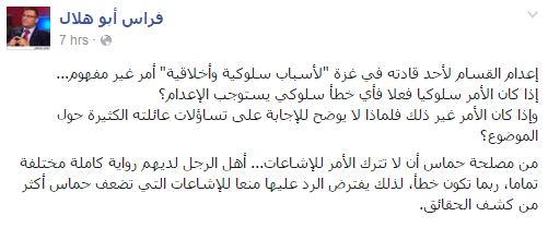 قال الكاتب والباحث في شؤون الشرق الأوسط فراس أبو هلال، إن إعدام القسام لأحد قادته في غزة -لأسباب سلوكية وأخلاقية- أمر غير مفهوم، مشيرًا إلى أنه إذا كان الأمر سلوكيًا فعلًا فأي خطأ سلوكي يستوجب الإعدام؟