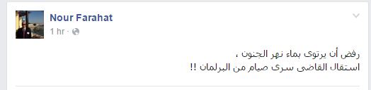 وقال فرحات عبر حسابه الشخصي بموقع التواصل الاجتماعي “فيس بوك” إن سري صيام رفض الارتواء من نهر الجنون، مشيرا إلى جنون مجلس نواب السيسي في تصرفات أعضائه وقراراته غير المنطقية.