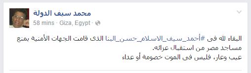 هاجم الباحث السياسي محمد سيف الدولة، أجهزة الأمن المصري، بعد منعها إقامة عزاء نجل مؤسس جماعة الإخوان المسلمين المحامي أحمد سيف الإسلام حسن البنا، وذلك خلال تعليق نشره بموقع التواصل الاجتماعي “فيس بوك”.