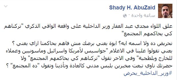 وكتب عبر منشور له على “فيس بوك”: علق اللواء مجدي عبد الغفار وزير الداخلية على واقعة الذكري: “تركناهم كي يحاكمهم المجتمع“.