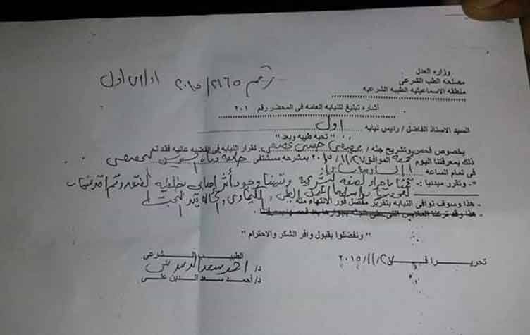 ولقي طبيب بيطري من الإسماعيلية يدعى عفيفي حسني عفيفي 48 عاما، مصرعه عقب توجه قوة من مباحث المديرية بقيادة الملازم أول محمد إبراهيم، مباحث قسم شرطة أول، إلى صيدلية زوجته وقام بالتعدي عليه، وعقب اصطحابه إلى قسم الشرطة تعرض للضرب وأصيب في رقبته ونقل على أثرها للمستشفى الجامعي، الذي تأكد من خلال التقرير الطبي أن الوفاة جاءت نتيجة التعذيب.