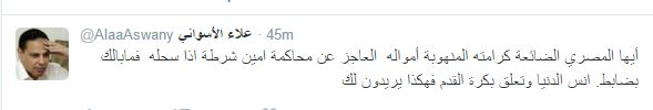 وقال “الأسواني” خلال تغريدة نشرها عبر حسابه الشخصي بموقع التغريدات القصيرة “تويتر” إن “تعلق المصري بالكرة هو هدف مطلوب لإغفاله عن ضياع كرامته ونهب أمواله وعجزه عن محاكمة أمين شرطة إذا سحله”.