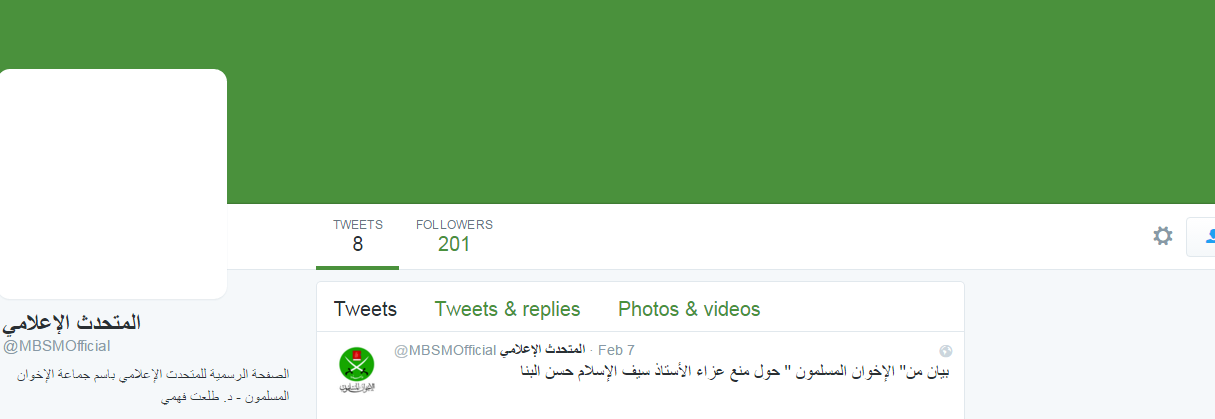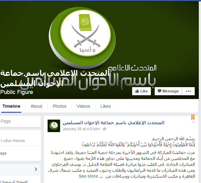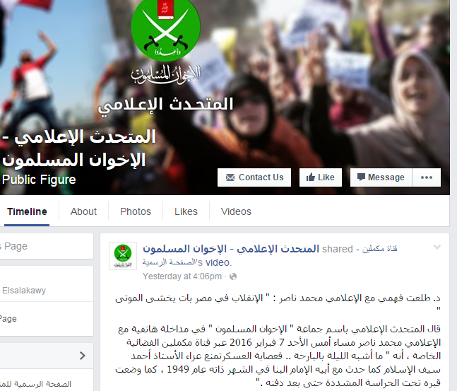 صفحتان  لـ”المركز الاعلامي للإخوان المسلمين” على “فيس بوك” و”تويتر”، أحدهما تدعم طلعت فهمي كمتحدث إعلامي وأخري تدعم  محمد منتصر كمتحدث إعلامي.
