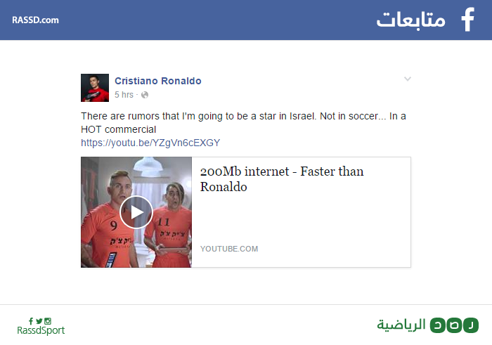 وجاء إعلان رونالدو عن ظهوره في الإعلان الإسرائيلي عبر منشور كتبه على صفحته الرسمية على موقع التواصل الإجتماعي “فيس بوك”، معلقًا عليه:” هناك شائعات تقول بأني سأكون نجمًا في إسرائيل، ولكن ليس في كرة القدم”.