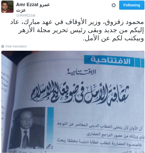 وقال في تغريدة له على موقع التدوين المصغر “تويتر”: “محمود زقزوق، وزير الأوقاف في عهد مبارك، عاد إليكم من جديد وبقى رئيس تحرير مجلة الأزهر وبيكتب لكم عن الأمل”.