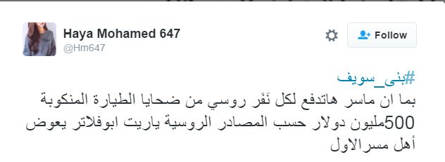 Haya Mohamed : بما إن ماسر هاتدفع لكل نَفَر روسي من ضحايا الطيارة المنكوبة 500 مليون دولار حسب المصادر الروسية ياريت أبو فلاتر يعوض أهل مسرالأول.