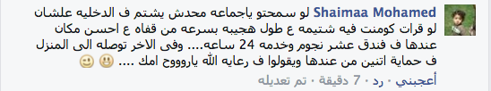 وقالت “شيماء محمد”: “لو سمحتوا يا جماعة محدش يشتم في الدخلية علشان لو قرأت كومنت فيه شتيمة ع طول هجيبه بسرعة من قفاه ع أحسن مكان عندها في فندق عشر نجوم وخدمة 24 ساعة.. وفي الآخر توصله إلى المنزل في حماية اتنين من عندها ويقولوا في رعايه الله ياروووح أمك”.