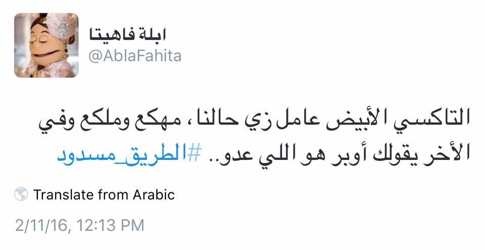 سخرت الدمية الشهيرة “أبلة فاهيتا”، مقدمة برنامج “لايف من الدوبلكس” من إضراب سائقي التاكسي، وذلك في تغريدة نشرتها عبر حسابها الشخصي بموقع التغريدات القصيرة “تويتر”.