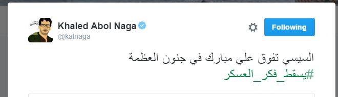 وقال أبوالنجا في تغريدة له على حسابه بموقع “تويتر”: “السيسي تفوق على مبارك في جنون العظمة”، وتابع قائلا “يسقط فكر العسكر”.