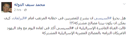 واستنكر سيف الدولة عبر حسابه بموقع التواصل الاجتماعي “تويتر” من وجود مصالح مشتركة مع الإسرائيليين، مستفهما عن مدى جرأة السيسي على شرح تلك المصالح أمام البرلمان في خطابه.