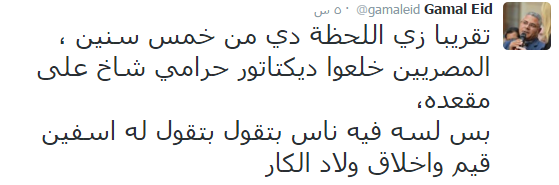 هاجم الناشط الحقوقي جمال عيد المؤيدين للمخلوع حسني مبارك مؤكدا سيرهم على نفس نهجه، لافتًا إلى أن تباكيهم عليه يوضح قيم وأخلاق “أولاد الكار”.