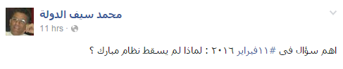 وأكد الباحث في الشأن القومي العربي محمد سيف الدولة عن طريق منشور له على حسابه بموقع التواصل الاجتماعي “فيس بوك” على عدم سقوط نظام مبارك مكتفيا بسؤال “لماذا لم يسقط نظام مبارك؟”.