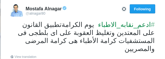 لقيت الانتفاضة الحاشدة لنقابة الأطباء الجمعة 12 فبراير 2016 ضد الانتهاكات الشرطية في المستشفيات، تأييدا واسعا من نشطاء وسياسيين وفنانين وحقوقيين عبر صفحات ومواقع التواصل الاجتماعي من خلال هاشتاج “أدعم  نقابة الأطباء”.