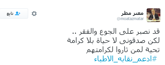وطالب الناشط السياسي د. حازم عبد العظيم بدعم الأطباء، واصفا قضيتهم بمعركة الكرامة للشعب المصري.