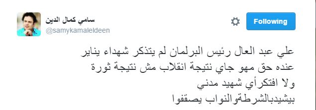 سامي كمال الدين: “علي عبدالعال رئيس البرلمان لم يتذكر شهداء يناير.. عنده حق مهو جاي نتيجة انقلاب مش نتيجة ثورة، ولا افتكرأي شهيد مدني، بيشيد بالشرطة والنواب يصقفوا”.