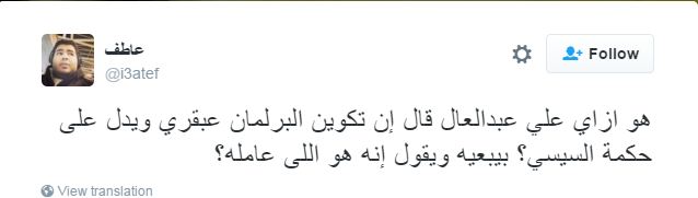عاطف: “هو ازاي علي عبدالعال قال إن تكوين البرلمان عبقري ويدل على حكمة السيسي؟ بيبعيه ويقول إنه هو اللي عامله؟”.