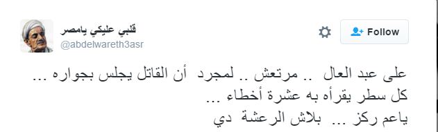 abdelwareth3asr: “على عبدالعال.. مرتعش.. لمجرد أن القاتل يجلس بجواره.. كل سطر يقرأه به عشرة أخطاء.. ياعم ركز.. بلاش الرعشة دي”.