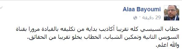 وقال -عبر منشور له على “فيس بوك”-: “خطاب السيسي كله تقريبًا أكاذيب بداية من تكليفه بالقيادة مرورًا بقناة السويس الثانية وتمكين الشباب، الخطاب يخلو تقريبًا من الحقائق”.