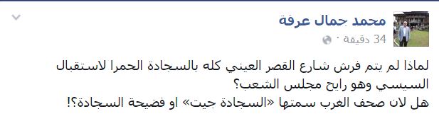 وقال “عرفة” -في منشور له على “فيس بوك”-: “لماذا لم يتم فرش شارع قصر العيني كله بالسجادة الحمرا لاستقبال السيسي وهو رايح مجلس الشعب؟”، مجيبًا بسخرية: “هل لأن صحف الغرب سمتها “السجادة جيت” أو فضيحة السجادة؟!“.