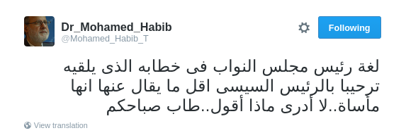 وقال “حبيب” في تغريدة عبر حسابه على “تويتر”: “لغة رئيس مجلس النواب فى خطابه الذى يلقيه ترحيبًا بالرئيس السيسي أقل ما يقال عنها إنها مأساة، لا أدرى ماذا أقول.“.